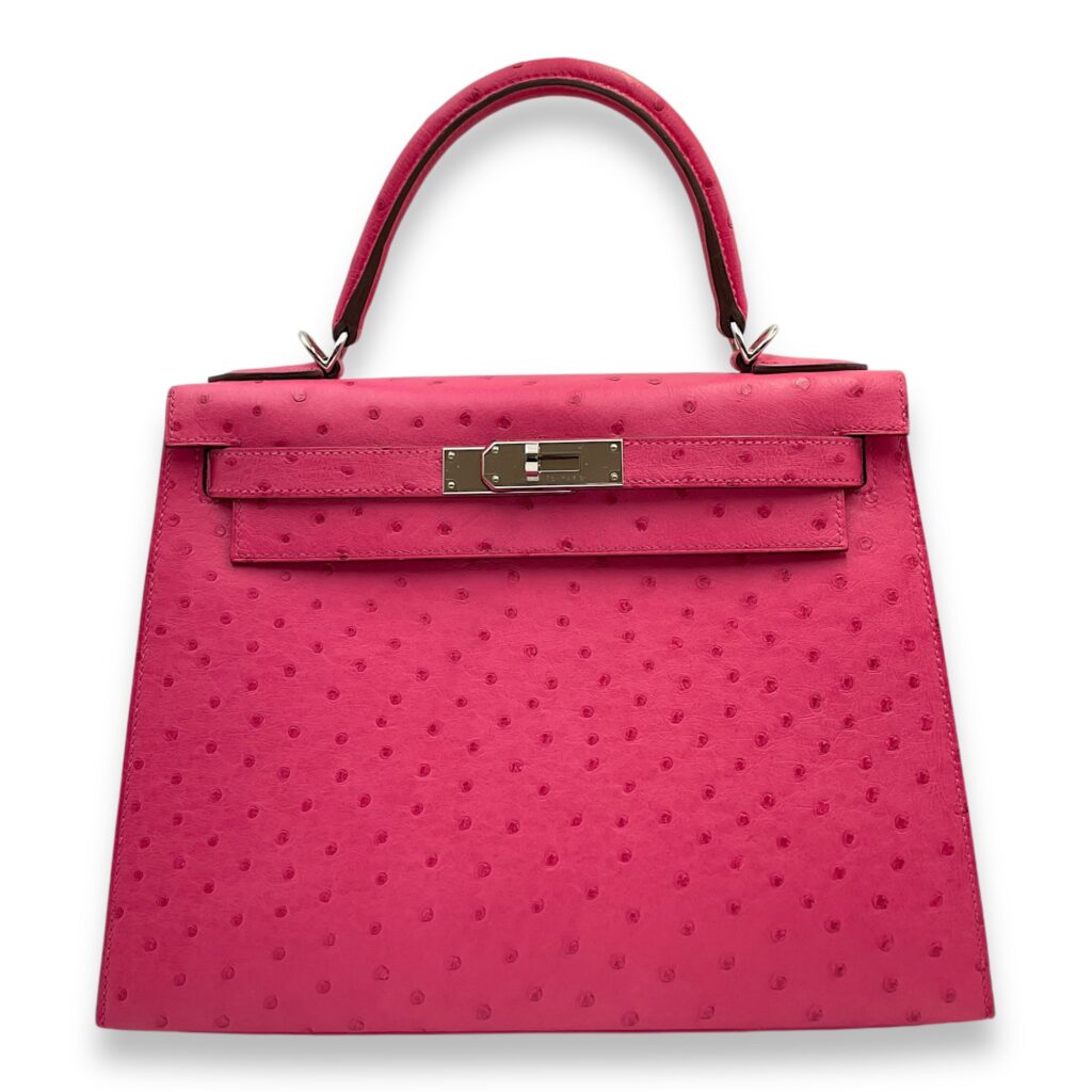 Sellier Kelly 28 Pink in Ostrich, Palladium hardware
