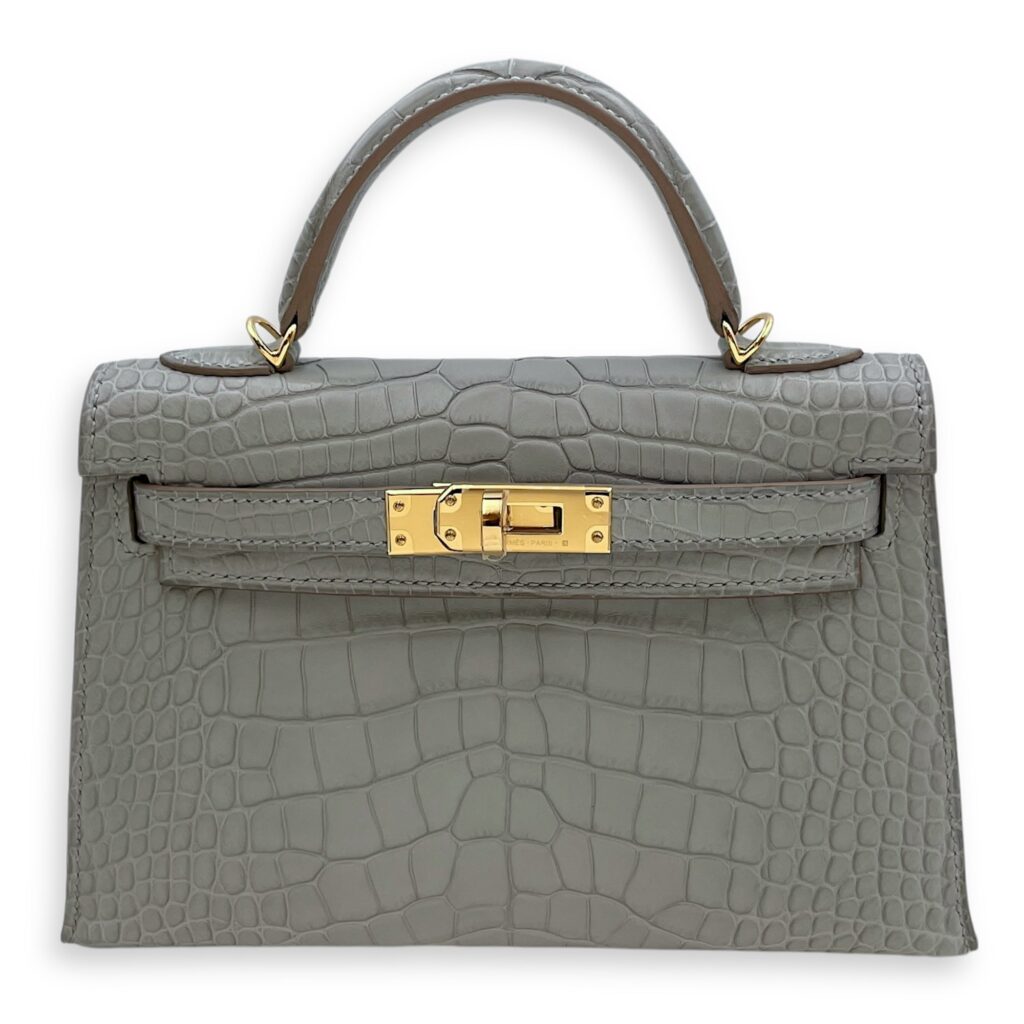 Sellier Kelly 20 Gris Perle in Matte Alligator, Gold hardware